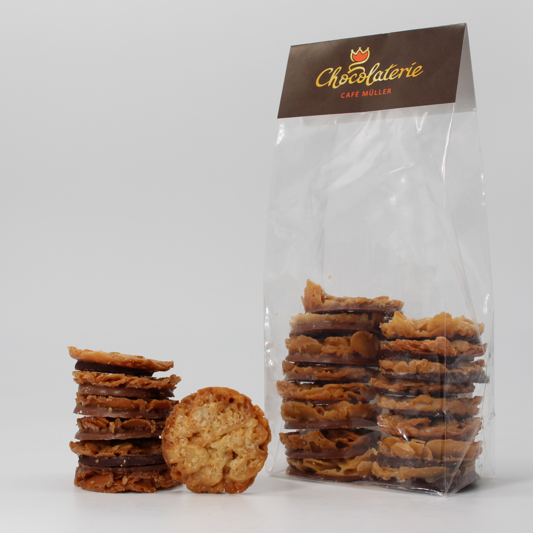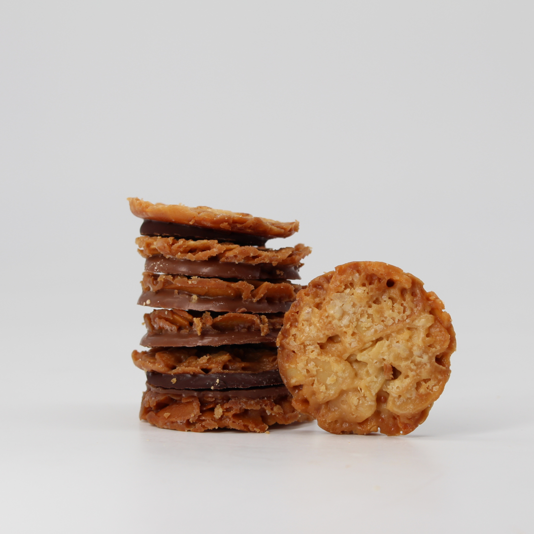 Unsere Mini Florentiner sind kleine knusprige Plätzchen aus karamellisierten Mandeln, sie sind süß, buttrig und knackig. Der Boden unserer Florentiner ist zur einen Hälfte mit feinster dunkler und zur anderen Hälfte mit feinster Vollmilch Kuvertüre überzogen.