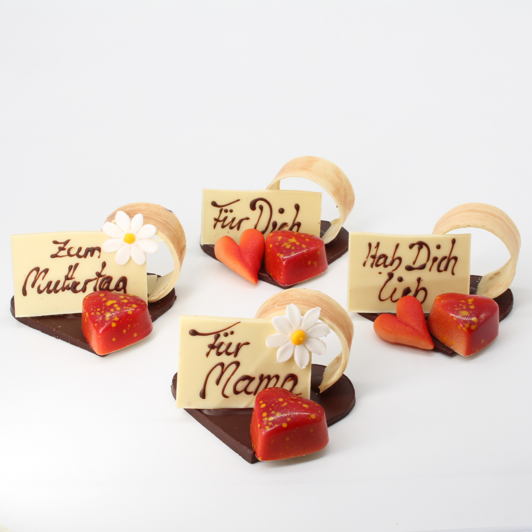 Das Besondere: Wähle aus vier liebevollen Schokoladen-Aufstellern deine persönliche Botschaft: