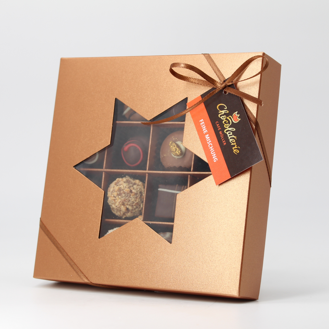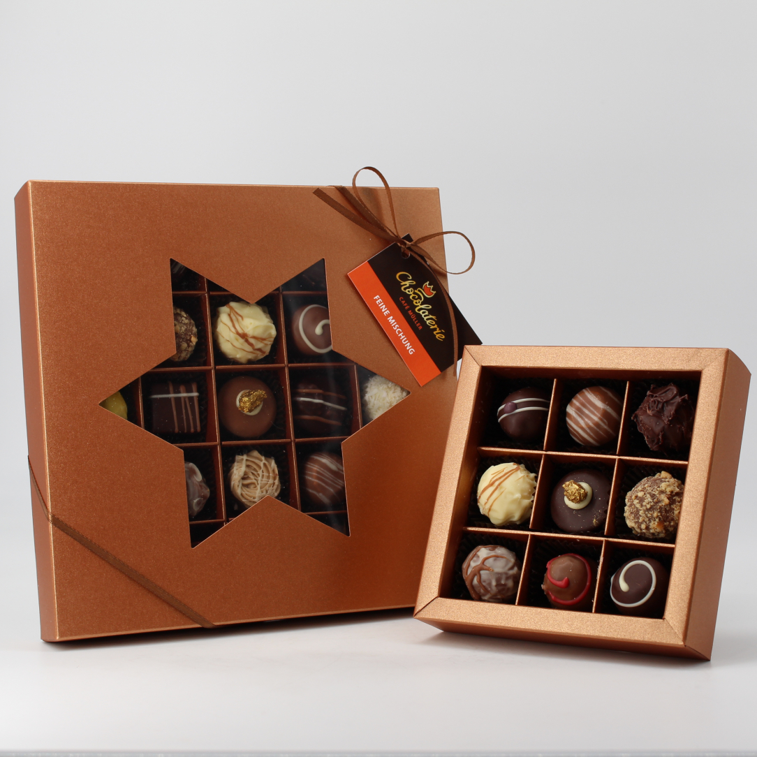Zucker, Kakaomasse, Kakaobutter, Magermilchpulver, Vollmilchpulver, Rahmpulver, Emulgator: Sojalezithin (E322), Haselnüsse, Mandeln, Walnüsse, Glucosesirup, Sahne, Fruchtmark, Kaffee, Vanille.